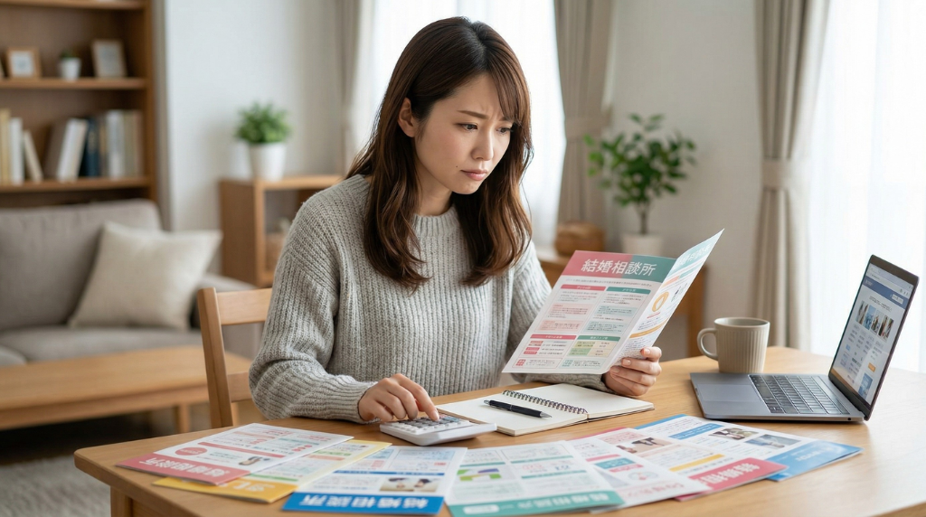 入会金の安さだけを見て判断するのは危険です。「入会金+初期費用+月会費×活動月数+お見合い料+成婚料」のトータルコストを算出し、「半年で成婚した場合」と「1年で成婚した場合」の2パターンでシミュレーションすると現実的な比較ができるでしょう。お見合い料の有無は活動スタイルに直結する項目で、年間18万〜48万円の差が生じることもあるため、必ず確認してください。